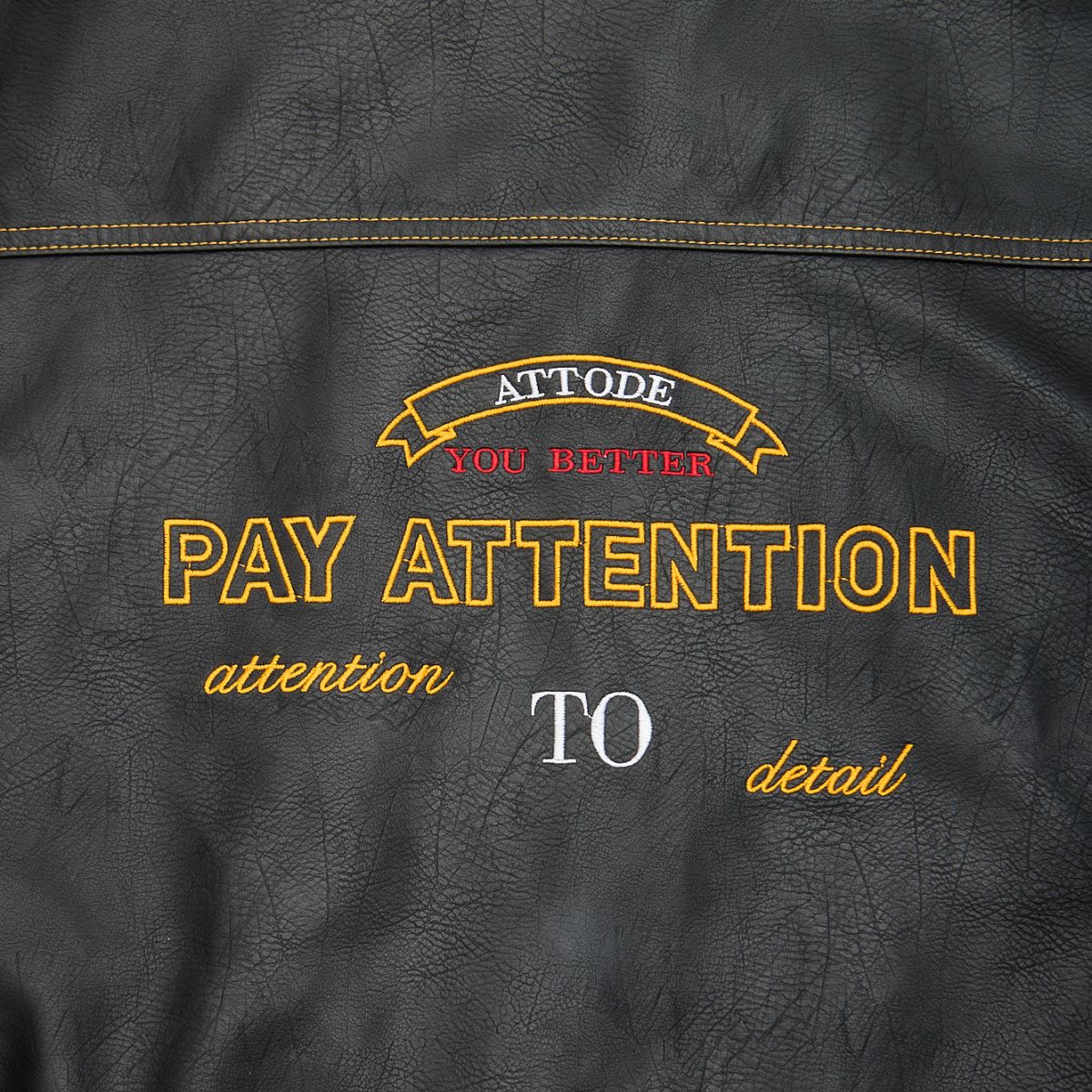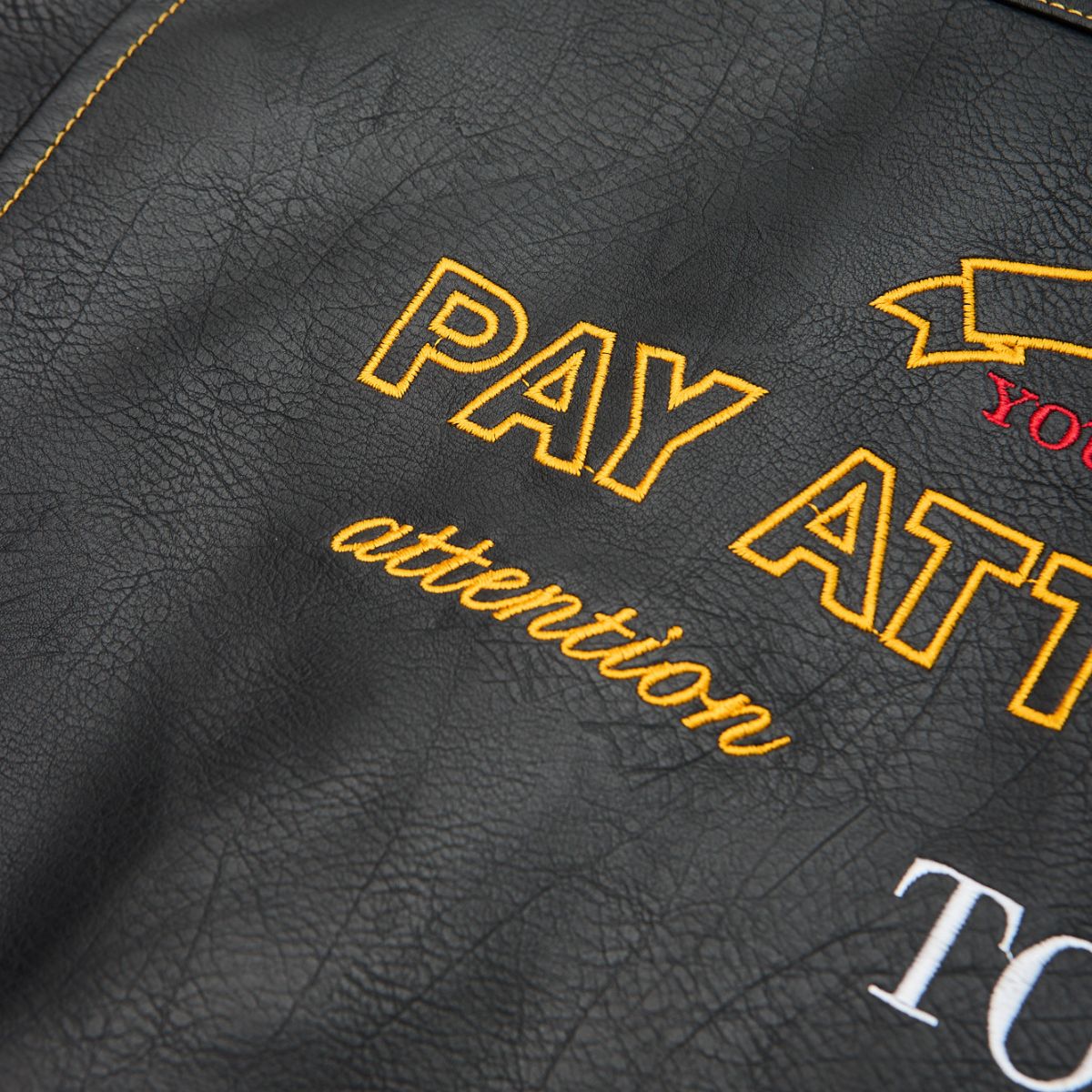 Crafted from high-quality faux leather, the Leather Jacket delivers the attitude of a classic biker silhouette without compromise. Defined by bold yellow contrast stitching, every seam is designed to stand out and give the jacket a structured edge.